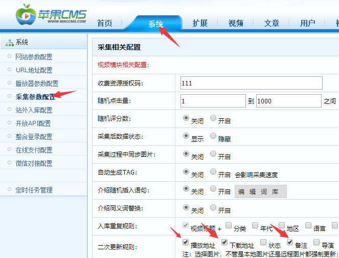 采集后没有更新数据有的会员朋友采集资源后,状态或者下载地址虽然提示了成功并没有更新成功,可检查下是否勾选了下图中的选项。
