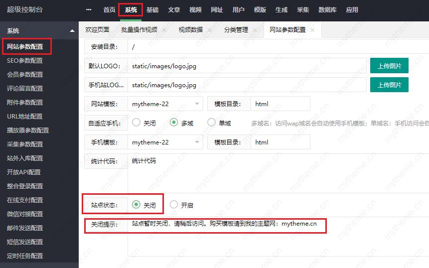 苹果CMS设置网站临时关闭维护方法 作者: 无 • 更新时间:2025-11-18 •阅读 网站难免有时候需要暂停维护下,苹果CMS后台自带这种非常友好的网站临时关闭的提示功能。 我们只需要登录后台-系统-网站参数配置-基本设置-站点状态关闭-关闭提示(填写自己想要显示的文字)。 本文采摘于网络,不代表本站立场,转载联系作者并注明出处:https://www.jsjds.com//pgjc/249.html