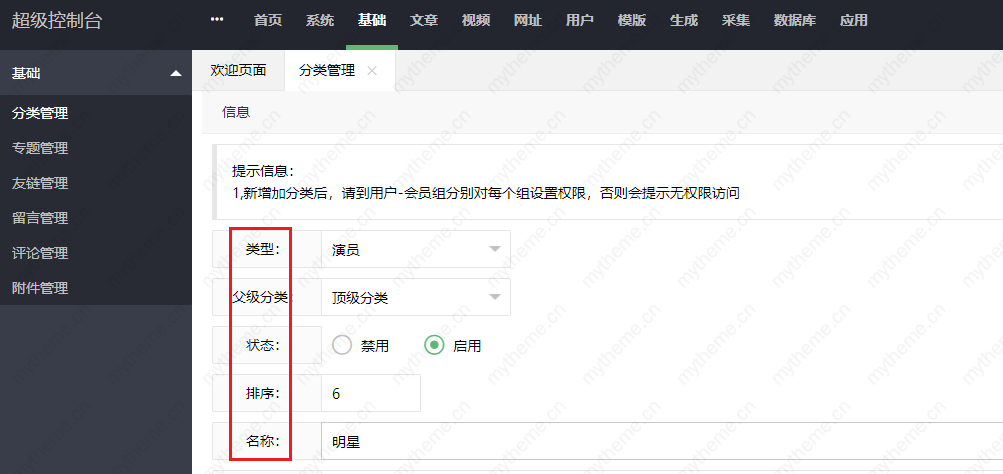 三,分类添加完了以后需要开启权限才可以显示,具体教程可参考:苹果cms提示无权限访问解决方法 来开通权限。