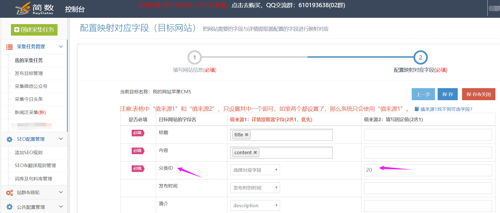 标题(必填):一般对应采集字段title,在 ‘来源值1’ 中选择即可;(可多选组合字段);内容(必填):为正文部分,一般对应采集字段content, 在 ‘来源值1’ 中选择即可;(可多选组合字段);