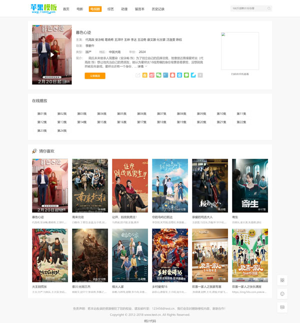 这是一款十分经典的白色影视网站模板,在传统布局基础上,将幻灯片修改为了双图展示及滑动,更多展示空间;同时增加了右侧排行榜及文本内容,以提高网站页面的原创性特点;详情页与播放页则是保留了传统布局,尊重访客的浏览习惯。此外最大改变,对模板页面进行了极致压缩删减,最大化追求访问速度,可以说是目前已知白色影视模板中的最小体积,压缩包只有192kb,精简比例高达90%以上。